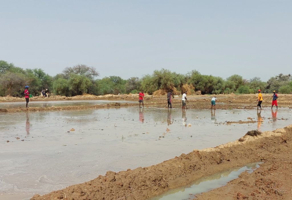 Oggi visitiamo due delle 8 parcelle di 5 ettari ciascuna in dotazione alle squadre di giovani per la risicoltura. A Tufunde’ Bali vediamo 15 giovani con il rastrello mentre pareggiano una parte di campo già allagata.  È in funzione una motopompa che prende l’acqua dal Ngalinka, braccio del fiume Senegal. Qui il lavoro è in gran parte manuale, anche la semina lo è.  Visitiamo poi un secondo terreno nel comune di Dodel, il campo in questo caso è molto più distante dal centro abitato principale.  Seguendo la pista di terra sul fuoristrada ci avviciniamo di nuovo al Ngalinka.  Una parte del campo è già stata coltivata e 12 giovani si preparano al raccolto (ci sono tre raccolti di riso all’anno nella regione).