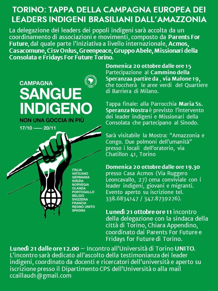 Tappa finale: alla Parrocchia Maria Ss. Speranza Nostra è previsto l’intervento dei leader indigeni. Sarà visitabile la Mostra: “Amazzonia e Congo. Due polmoni dell’umanità” presso i localidell’oratorio, via Chatillon 41, Torino