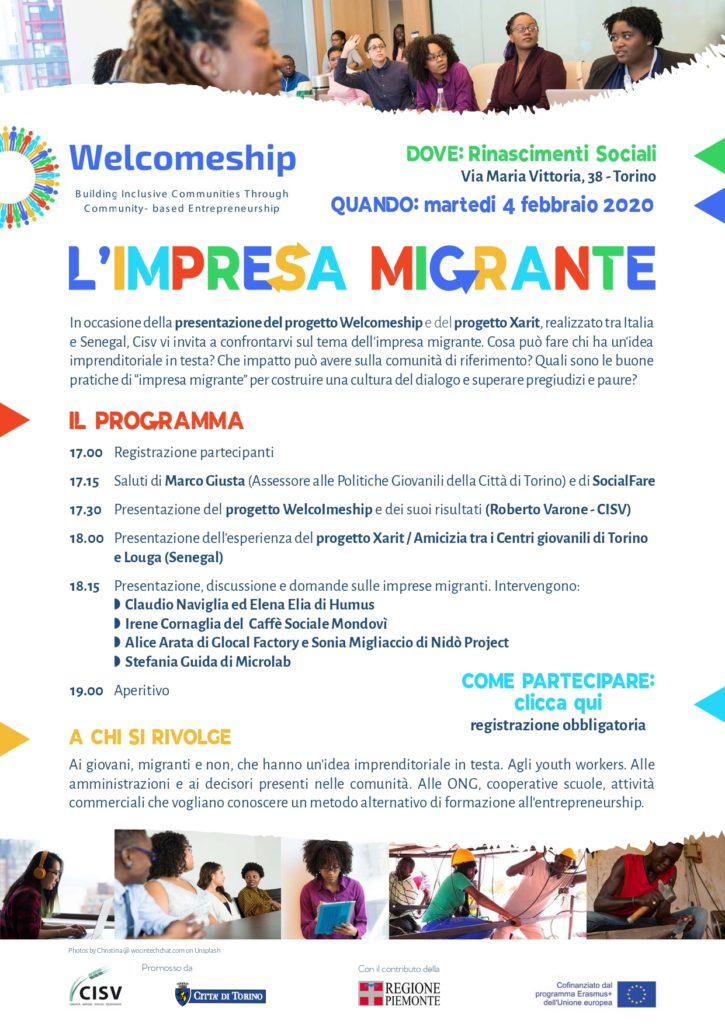 Il progetto Welcomeship vi invita a all’evento “Impresa migrante: building inclusive communities” di che cosa si tratta? un incontro dove si presenteranno i risultati ottenuti negli ultimi due anni insieme ai giovani migranti e rifugiati, giovani locali e youth workers con un’idea imprenditoriale in testa. Fare impresa di comunità vuol dire coltivare spirito di iniziativa, migliorare il territorio locale e creare comunità inclusive. Il progetto può contare su 9 partner in 7 paesi diversi, un corso di formazione sulla community based enterpreneurship suddiviso in 5 moduli per giovani migranti e rifugiati.