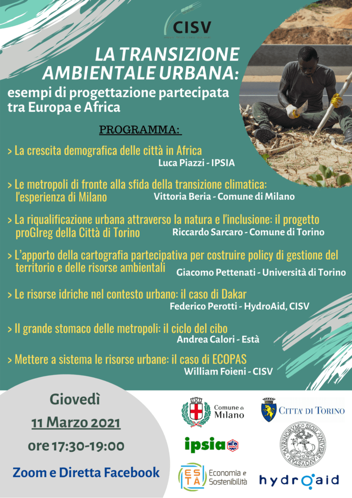 CISV, insieme a IPSIA, il Comune di Milano, il Comune di Torino, L’università degli Studi di Torino, Està e HydroAid ti invita al webinar gratuito “La transizione ambientale urbana: esempi di progettazione partecipata tra Europa e Africa”.