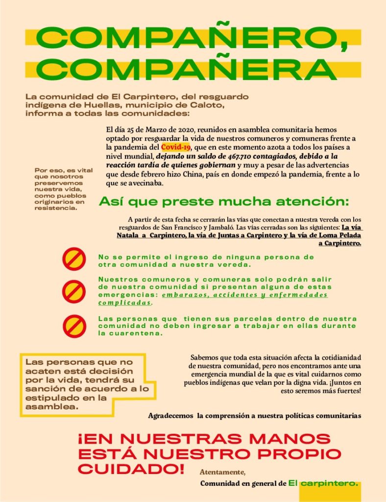 Il 17 marzo il Consiglio Regionale Indigeno del Cauca (CRIC) ha pubblicato una risoluzione in cui si elencavano le prime direttive per la prevenzione e la gestione del virus. Oltre alle misure attive su tutto il territorio nazionale rispetto alla limitazione degli spostamenti fuori casa e il protocollo sanitario da seguire per i casi di sospetto contagio, le autorità indigene hanno stabilito la chiusura di tutte le vie di entrata ai territori ancestrali, costituendo 387 punti di controllo in cui la Guardia Indigena impedisce l’entrata di chiunque sia esterno al territorio.