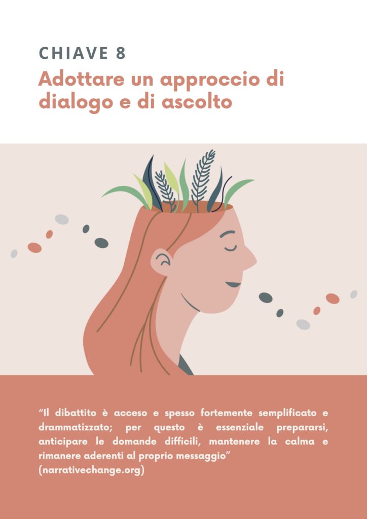 Se vogliamo coinvolgere tanti gruppi di persone, che non necessariamente sono già d’accordo con la nostra posizione, allora è imprescindibile avvicinarci in modo rispettoso a chi non la pensa come noi. Non si tratta di adottare buone maniere o di mostrare gentilezza in modo fine a sé stesso, ma occorre mostrarsi attenti ai punti di vista degli altri e saper rispondere usando toni che permettono di avviare un dialogo. Occorre imparare l’ascolto attivo, creando le condizioni adatte. Si impara provando e riprovando.