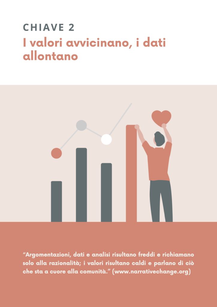 Argomentazioni, dati e analisi risultano freddi e richiamano solo alla razionalità; i valori risultano caldi e parlano di ciò che sta a cuore alle persone e alle comunità. Uno dei luoghi deputati allo studio critico dei dati è sicuramente la scuola e non si vuole quindi negare che si debba anche dedicare tempo e approfondimento alla ricerca dei dati e al saper riconoscere le fake news. Ma si suggerisce di farlo, solo dopo aver dato priorità ai “valori che avvicinano”.